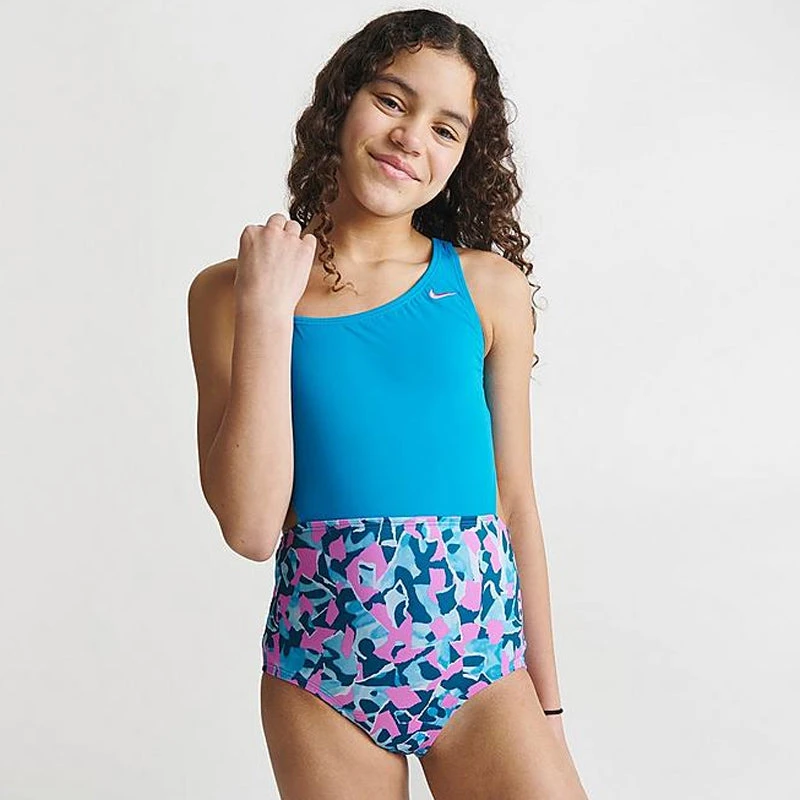 Designed for the young athlete, the asymmetrical monokini from Nike can take you from the lap lane to the water park. Made from soft durable fabric and designed with an ergonomic enhanced fit, this one piece monokini swimsuit feels good and performs even better. Cross straps and an open back let you move freely while the standard bottom coverage keeps your lower half in check for everything from big dives to building sandcastles. A camo print bottom and asymmetrical top with the iconic Nike Swoosh give fun, sporty style. (NESSD731)