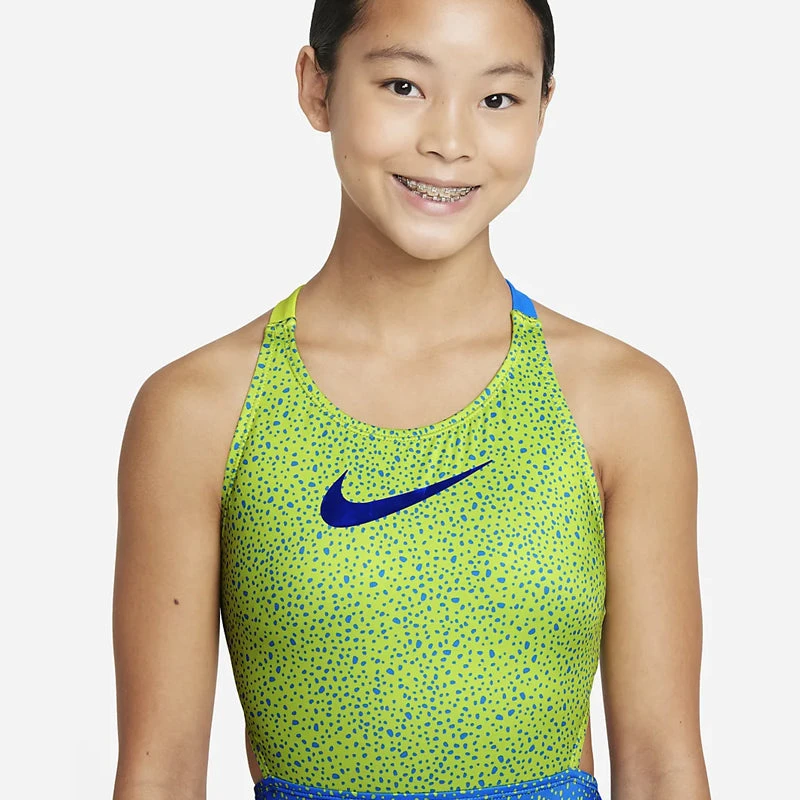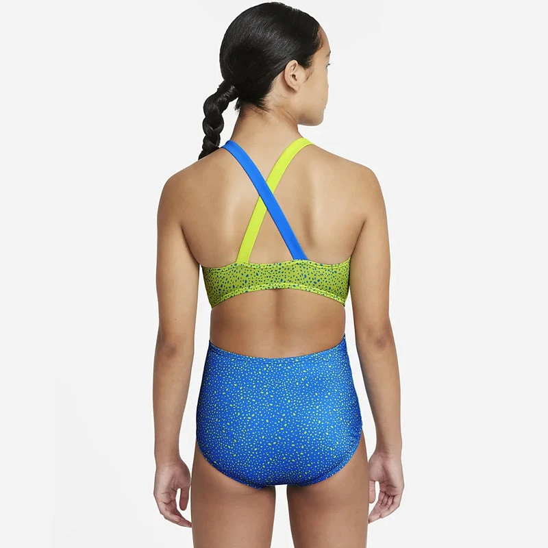 The Girls’ Nike Swim Water Dots Crossback Monokini is a cool, comfortable and contemporary addition to her swimwear collection. This sporty two-piece swimsuit has an ergonomic enhanced fit that’s ideal for young athletes and a crossback design that offers freedom of movement. The standard bottom coverage is ideal for all of her favorite water activities and a zipper garage offers enhanced comfort. Eye-catching color combos and an all-over dot print ensure this athletic swimsuit looks as good as it feels. (NESSC723)
