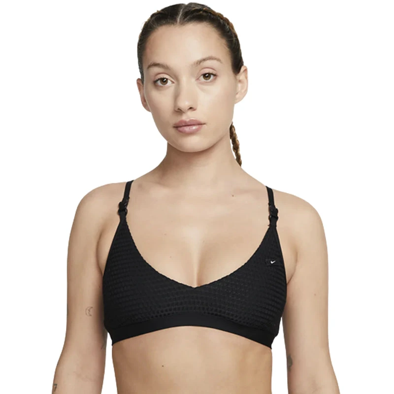 Run wild in this stylish and sporty bikini top from Nike. It’s made with soft jersey fabric that feels great on your skin and uses at least 75% recycled materials to help conserve natural resources. Fully lined for a better fit, you can customize this performance swimwear with an adjustable buckle and hook so you can feel confident in the pool or at the beach. Mesh insets along the sides and back help with breathability and water drainage so you won’t be slowed down once you hit the water. (NESSD256)